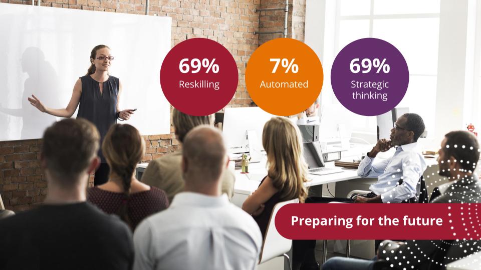 Preparing for an AI future is believed to necessitate at least moderate or significant reskilling, while a similar number of respondents highlighted the importance of strategic thinking and advisory skills.