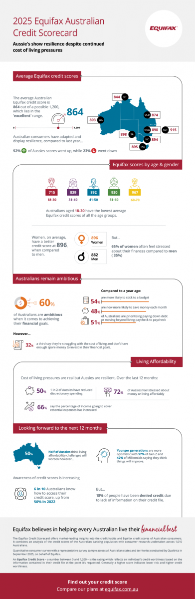Sydney, Australia – 8 December 2025 – The latest data from Equifax reveals Australians demonstrated strong financial resilience in 2025, amid an ongoing cost-of-living crisis, the national average credit score remained in the ‘Excellent’ range at 864 (out of a possible 1200), lifting by three points from the 2024 average of 861.