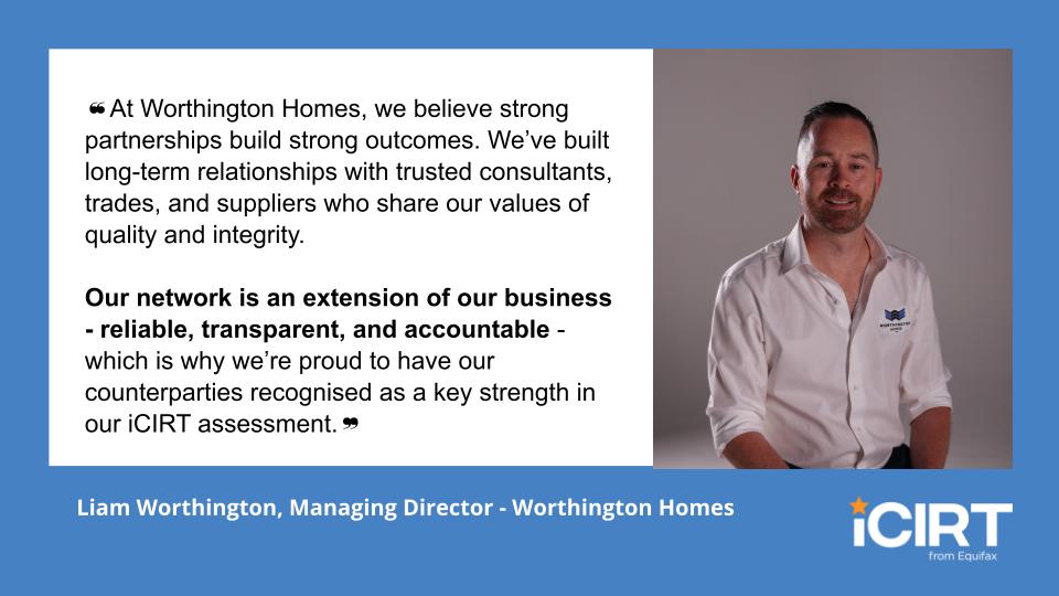 iCIRT rated Worthington Homes achieved a strong ‘Counterparties’ assessment score, reflecting the strength, governance, and track record of its business network.