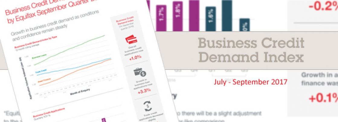 Sydney, Australia, Friday, 10 November 2017 – The Quarterly Business Credit Demand Index by Equifax, which measures the level of business loan, trade credit, and asset finance applications, rose at an annual rate of +1.0% in the September quarter, compared to the same period last year.